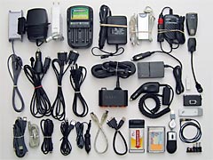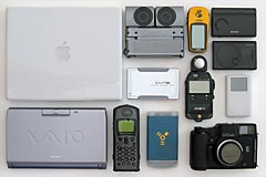 Computer, Telefon, GPS, Radio, Kameras - Apple iBook mit DVD und CD-RW (Mac OS X) - Sony Vaio (Sub-) Notebook (Windows XP) - Externe 60 GB FireWire/USB 2.0 Hard Disks - Motorola Iridium Satelliten-Telefon - Garmin eTrex GPS / Garmin GPSMAP 76 (nicht abgebildet) - Sony Weltempfänger mit Wide Range Antenna - Apple iPod 5 und 10 GB (zusätzlich ca. 50 GB MP3 Songs) - Sony Travel-Stereo-Lautsprecher - Fujifilm Mittelformatkamera und Minolta Belichtungsmesser - Canon PowerShot Digitalkameras (nicht abgebildet) |
